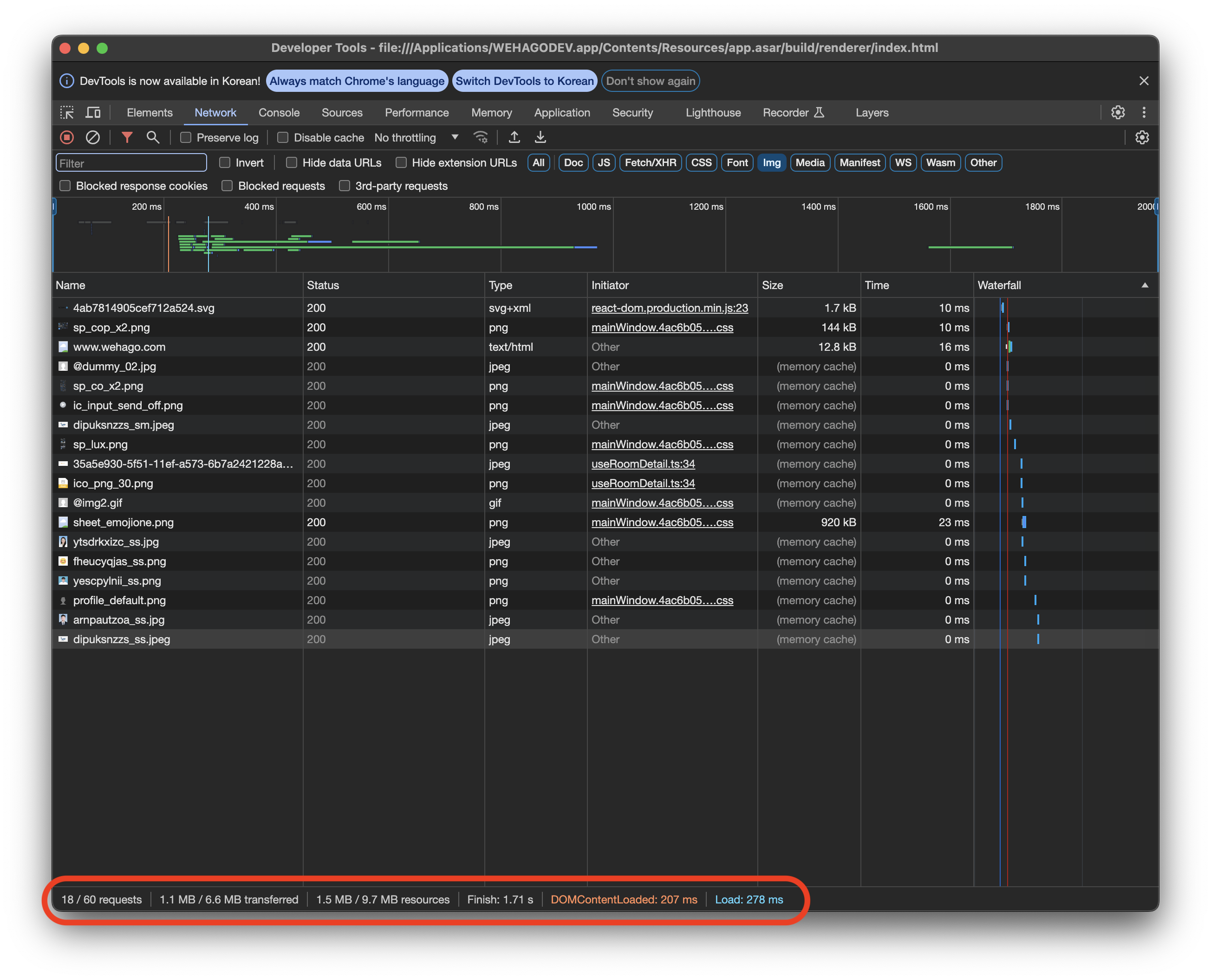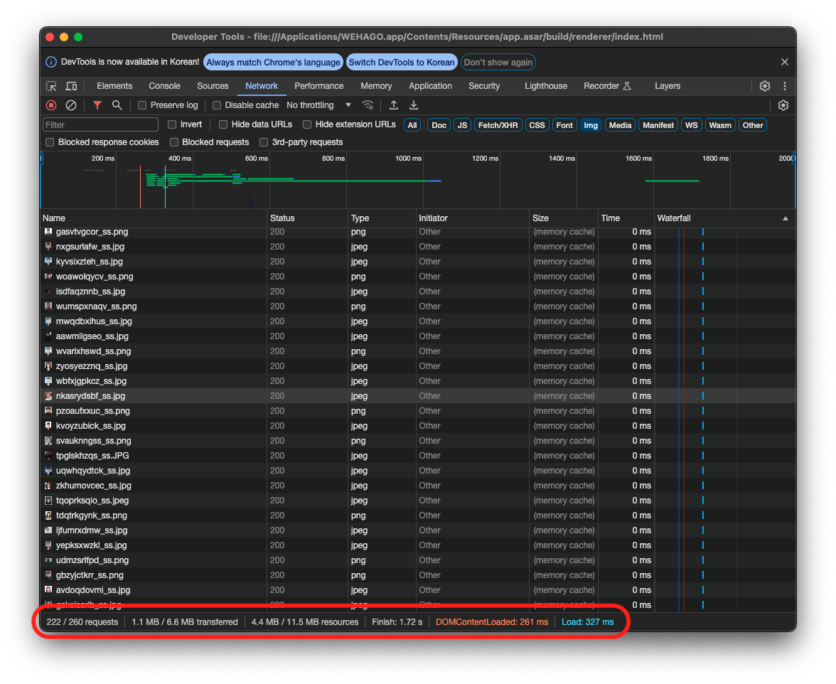 222/260(image request/total request)지연로딩 적용 후 Network 요청 수 :
