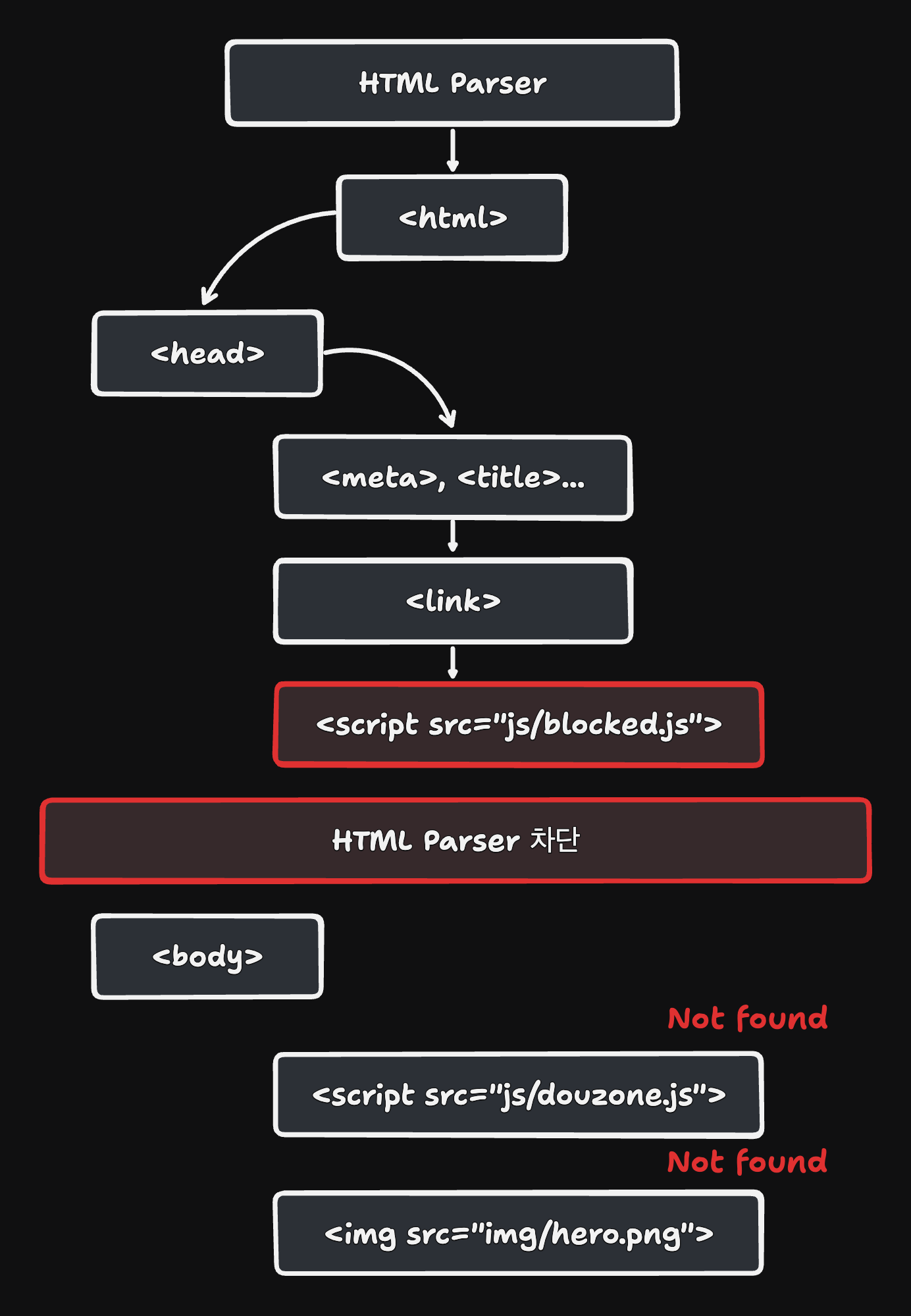 <script>) 태그를 만나면 제어권을 JavaScript 엔진으로 넘긴 뒤 해당 스크립트를 실행한 후에야 파싱을 계속합니다. 이로 인해 페이지 로딩이 지연될 수 있습니다. - Preload Scanner: Preload Scanner는 HTML 파서와 동시에 동작하는 비동기적인 프로세스입니다. HTML 파서가 DOM을 생성하는 동안, Preload Scanner는 파싱된 HTML 문서의 나머지 부분을 미리 훑어보면서 중요한 리소스(예: CSS, JavaScript, 이미지 등)에 대한 로드를 미리 시작할 수 있습니다.